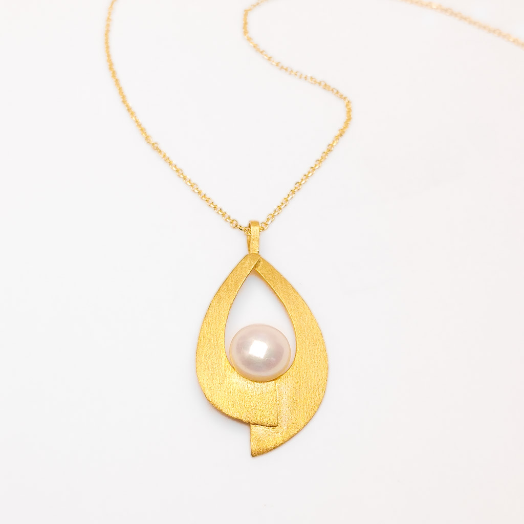 Χειροποίητο χρυσό μενταγιόν 14 καράτια με φυσικό μαργαριτάρι, σε ελαφρύ σαγρέ φινίρισμα, από τη συλλογή «Σύγχρονες Καρυατιδες».